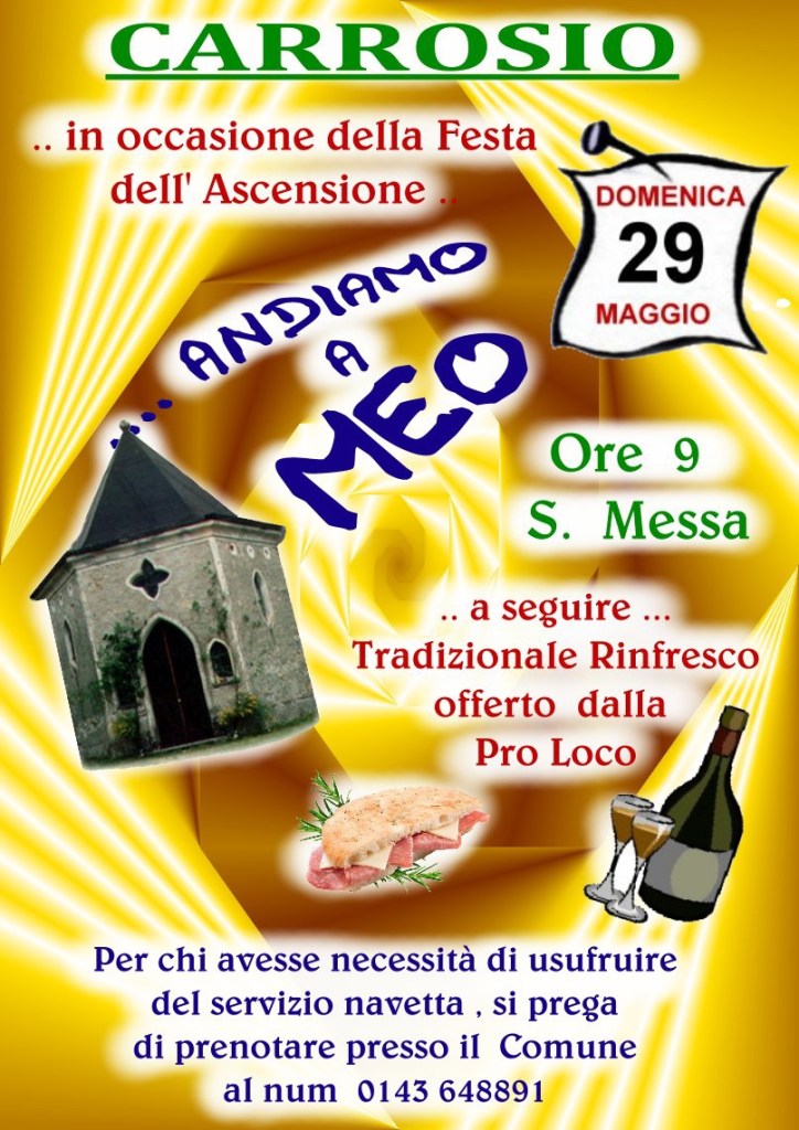 S.messa ore 9:00 a seguire il rinfresco offerto dalla Pro Loco di CarrosioPer il servizio navetta contattare il comune al n.0143648891
